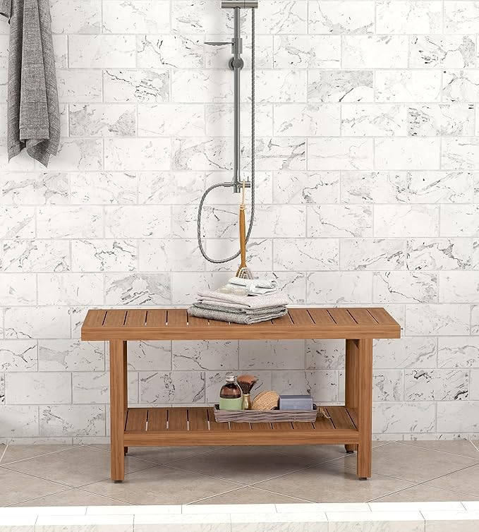 | AquaTeak 36″ Bench | Shower bench | Floor | Solid teak | Seat + shelf in shower |