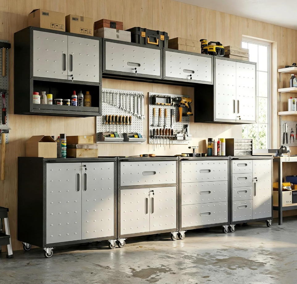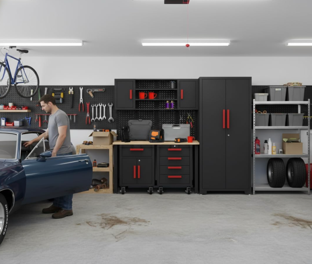 This set works especially well for garages that double as workspaces. You can use the work surface for repairs, home projects, gardening prep, or sorting household items, while the cabinets help hide visual clutter. If you want a cleaner garage without losing function, this is one of the more balanced options.